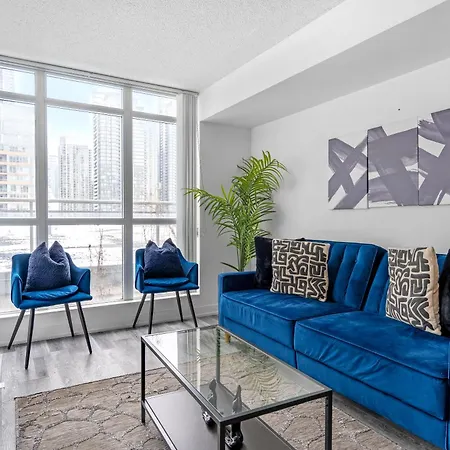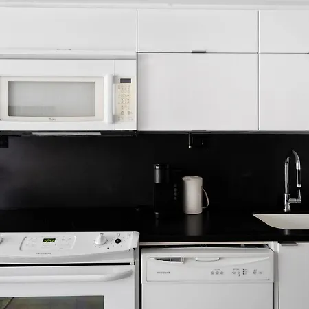 Modern One Bedroom And Den Condo By Cn Tower位于多伦多市中心区,距离比利-畢曉普多倫多市機場机场只有5分钟的车程. 在公寓还有配备冰箱,烤箱 和玻璃器具的设施齐全的厨房.